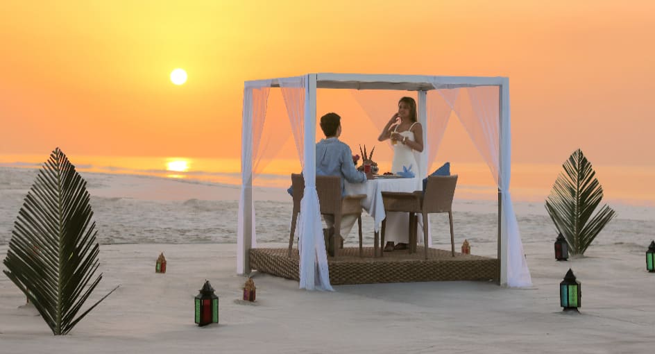Begin your morning with our exclusive Sunrise Breakfast, a serene beachfront dining experience set in a private cabana. As the golden sun emerges over the Arabian Sea, savour a chef-curated breakfast spread, sip on fresh juices, and let the tranquil sounds of the waves set the tone for your day. Romance, nature, and nourishment all in one unforgettable moment.