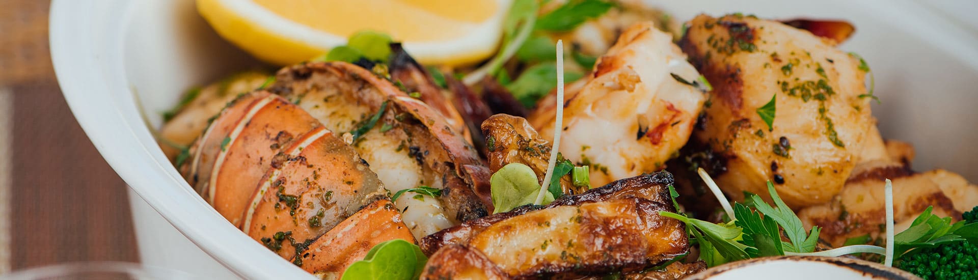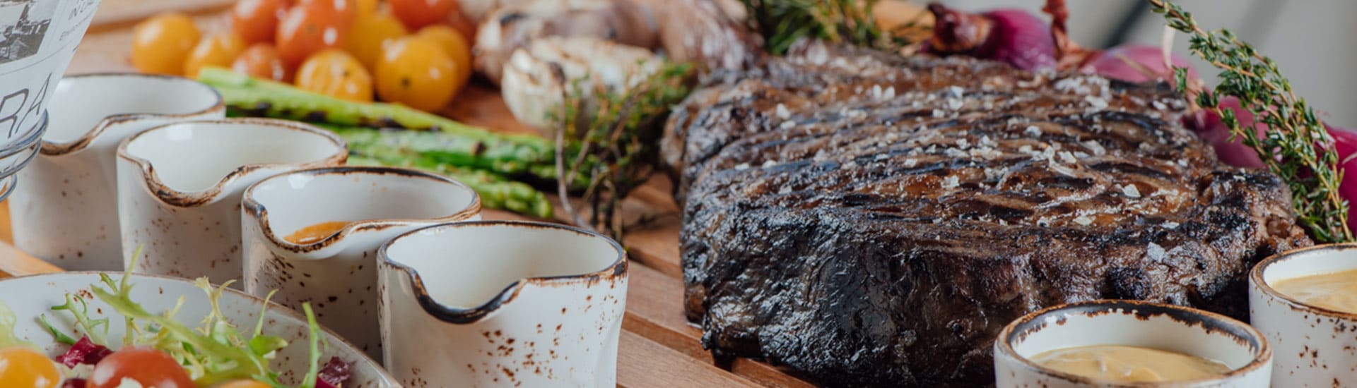 550日龄牛肉,6-9级,大理石花纹,三分熟,用明火或平底锅烤制,搭配配菜和经典蛋黄酱、胡椒和鸡油菌羊乳干酪酱。