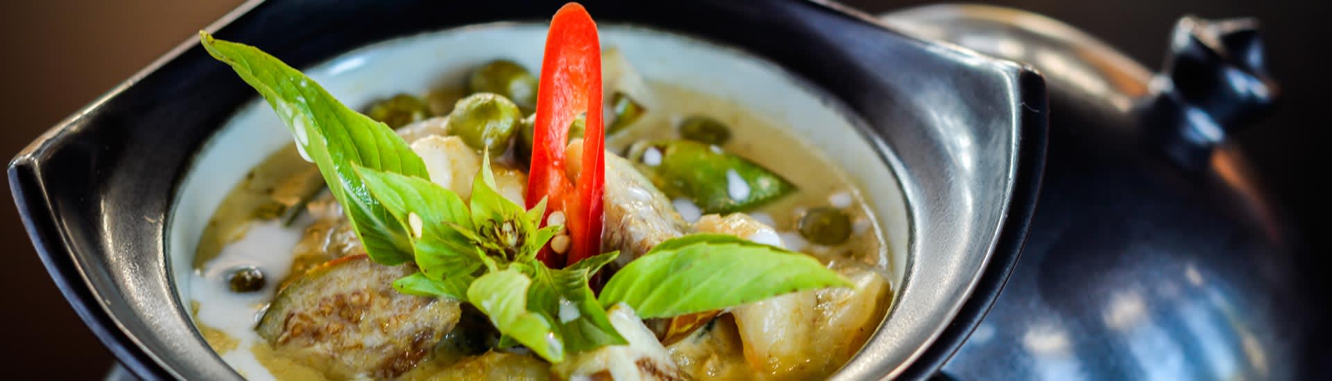 绿咖喱酱、椰奶、甜泰国罗勒、茄子和豌豆茄。