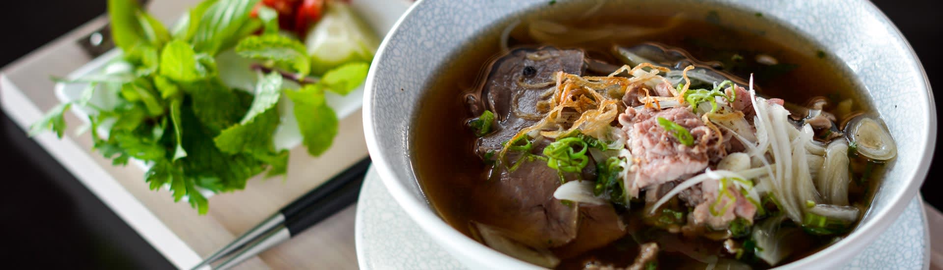 芳香四溢的汤底,配河粉、香菜、葱、豆芽、新鲜罗勒、青柠、辣椒蒜酱和牛肉片。