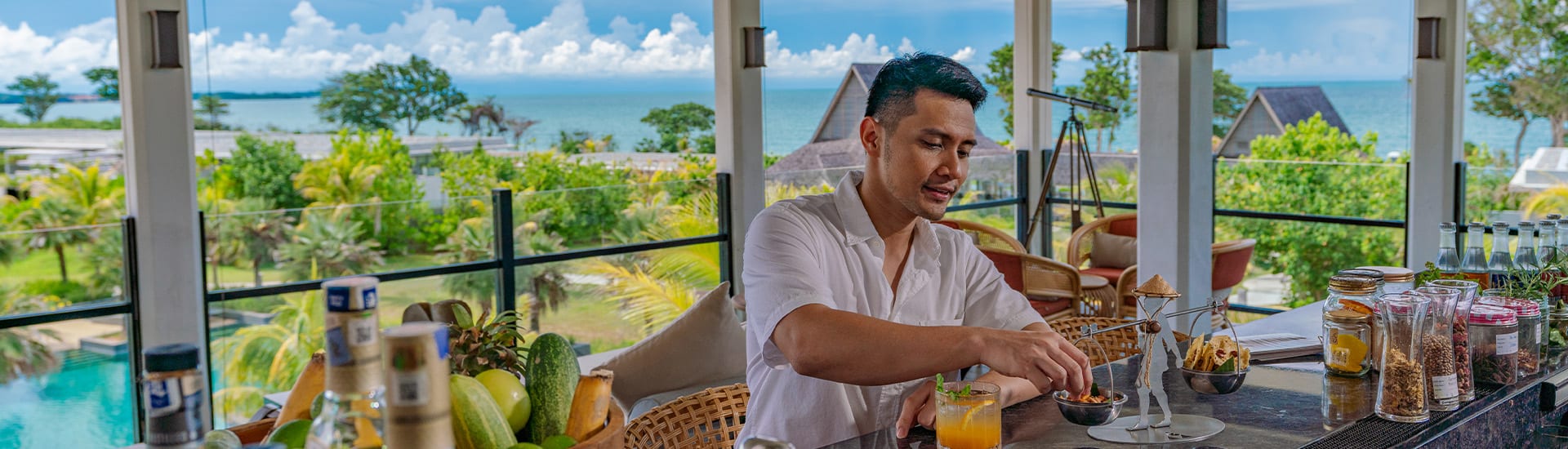 在度假酒店中心地带品鉴鸡尾酒和无酒精鸡尾酒。