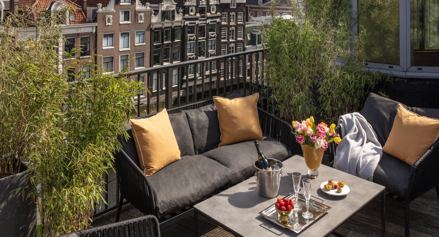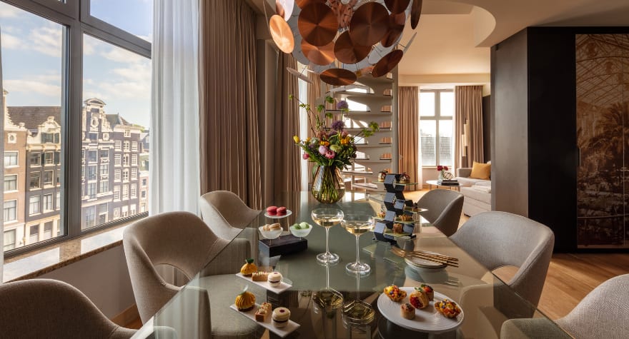 总统套房设有两个通向中央起居区的卧室套间。在洒满阳光的玻璃餐桌前享用美味早餐,或是前往屋顶露台,180°欣赏阿姆斯特丹的著名运河和屋顶美景。主浴室配备有豪华浴缸,供您尽情泡浴,放松身心。