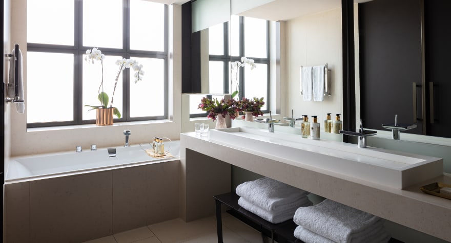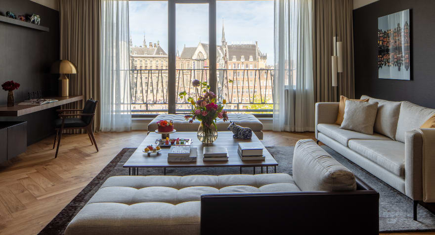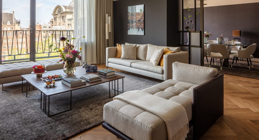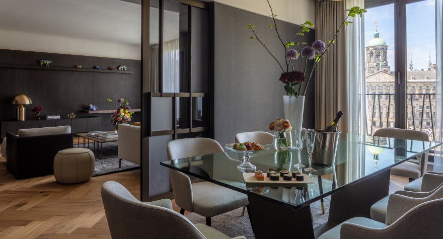 皇家套房内设典雅舒适的休息室、可改成会议室的餐厅以及准备茶点的茶水间,是招待宾客的理想之选。从卧室到阳台,几乎每个角度都可以欣赏水坝广场和皇宫的壮观景色,而躺在按摩浴缸中,则可以将城市屋顶的静谧美景尽收眼底。