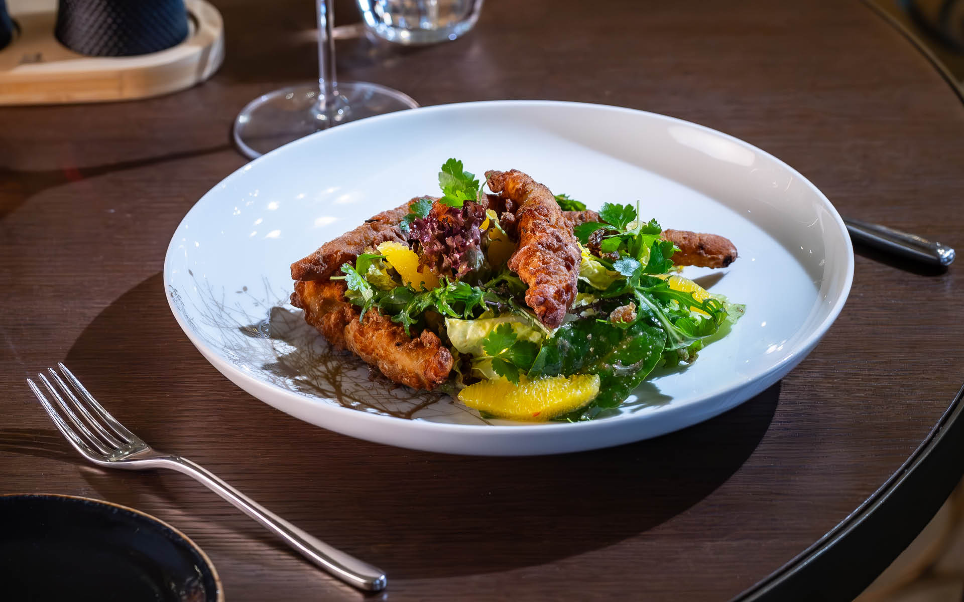 曼加利察猪排,搭配拉面酱汁、萝卜沙拉和土豆面团加酸奶油