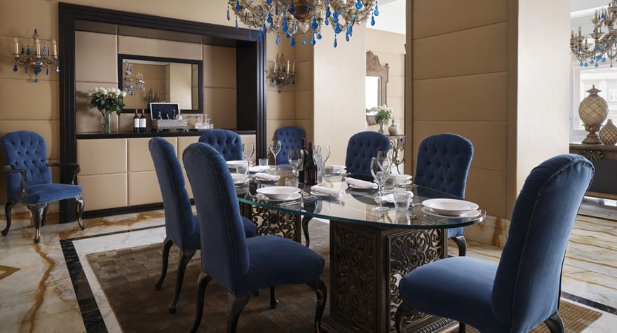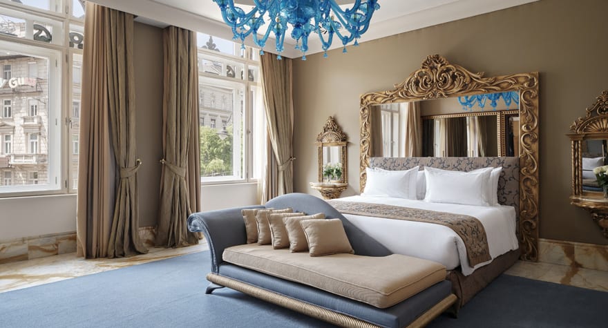 Sapphire 总统套房采用蓝色色调,充满现代风情的慕拉诺玻璃灯具点缀其间,各种金色家具优雅迷人,完美诠释了现代奢华品味。这个多功能空间可提供专门的用餐区/会议区。卧室宛如一处宁静的休憩港湾,透过大大的窗户,埃尔茨赛贝特大道(Erzsebet Boulevard)的美景尽收眼底,此外,还有一间配备有浴缸和淋浴器的马赛克瓷砖浴室。