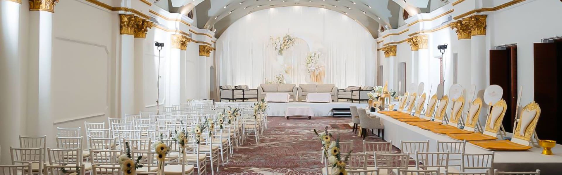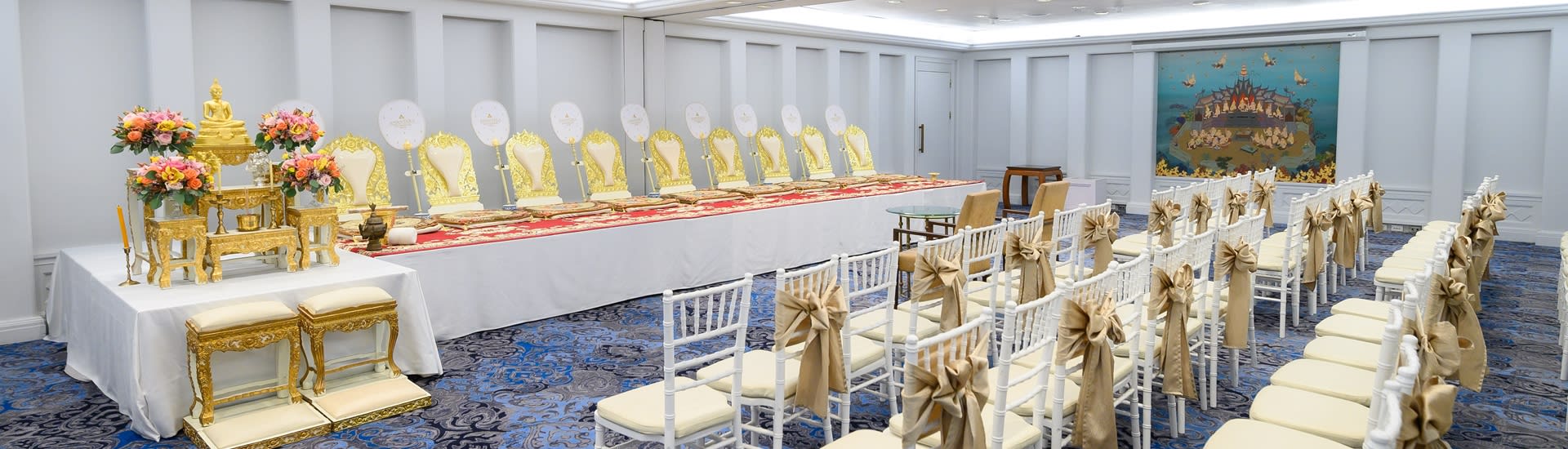 在装饰有手绘壁画的古典宴会厅招待宾客。 优雅的泰式特色和装饰有金箔和丝绸挂饰的侧柱为您的盛大婚礼增光加彩。