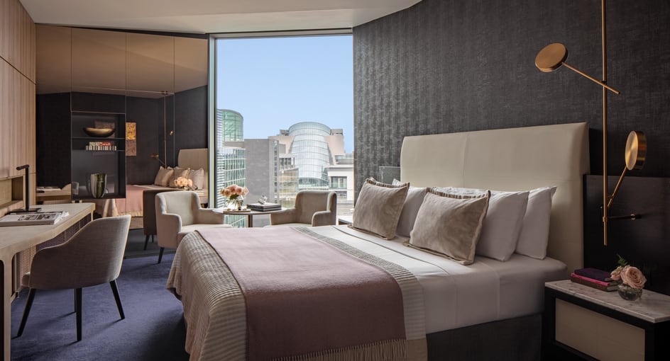 罗奇套房设有一间独立起居室,地面铺设有豪华地毯,房内摆放着枕头和毛毯、一组设计师沙发,原创画作点睛装饰,尽显奢华与舒适。罗奇套房以在都柏林出生,设计了都柏林会议中心(CCD)并斩获有着建筑界诺贝尔奖之称的“普利兹克奖”的建筑师凯文·罗奇(Kevin Roche)的名字命名。置身于这座套房中,可以俯瞰这座标志性建筑,以及备受喜爱的烟囱公园。