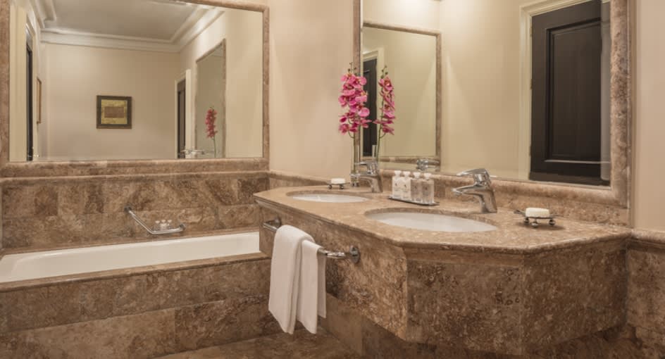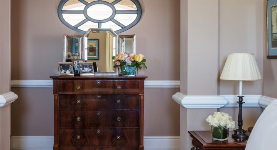 小套房散发着典雅的氛围,配有豪华家具、抛光木质家具、吊灯和脚下的波斯地毯。 洒满阳光的起居室通往主卧套房,里面设有大理石浴室。 享受宁静的时光,俯瞰修剪整齐的花园和远处的群山。