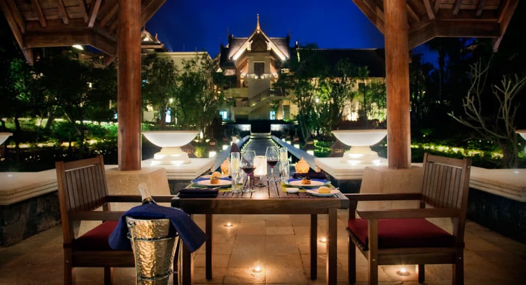 在烛光下用餐,周围环绕着度假酒店芬芳四溢的鲜花。